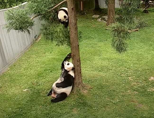 資料圖:“小奇跡”和“美香”在樹(shù)邊玩耍。來(lái)源:美國(guó)國(guó)家動(dòng)物園社交媒體
