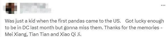 有網(wǎng)友回憶起與大熊貓的點(diǎn)滴時(shí)說(shuō),“當(dāng)?shù)谝慌笮茇垈儊?lái)到美國(guó)時(shí),我還只是個(gè)孩子。上個(gè)月很幸運(yùn)能前往華盛頓,我會(huì)想念它們的。謝謝你們帶來(lái)的回憶——美香、添添和小奇跡?!?/p>