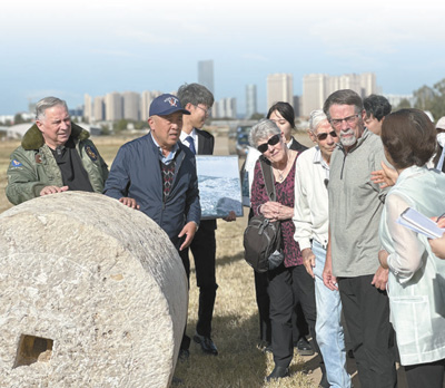 在云南昆明呈貢機(jī)場舊址,代表團(tuán)一行聆聽講解員講述石碾背后的故事。呈貢機(jī)場曾是飛虎隊(duì)在昆明的主要基地之一,機(jī)場建設(shè)期間,當(dāng)?shù)厝嗣窭瓌?dòng)巨大石碾平整跑道,付出艱苦努力。