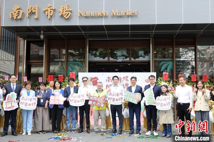 11月16日,經(jīng)過四年改建的臺北南門市場正式重新開業(yè),圖為出席開幕式的嘉賓剪彩后合影?!≈行律缬浾?陳小愿 攝