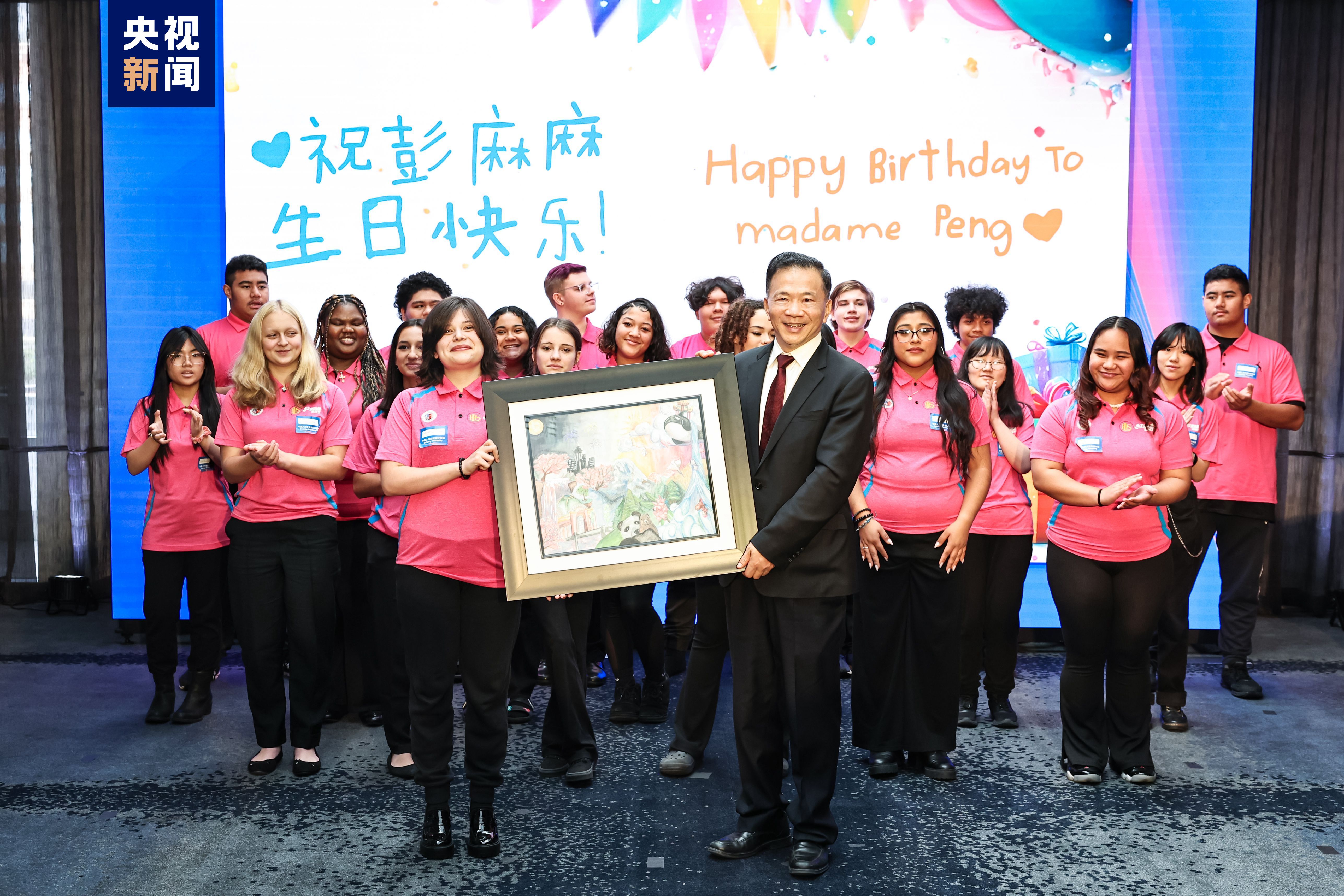 活動(dòng)現(xiàn)場(chǎng),來(lái)自華盛頓州林肯中學(xué)的合唱團(tuán)演唱了中文歌曲《在希望的田野上》和英文歌曲《伴我同行》,祝愿中美友誼的紐帶更加牢固,煥發(fā)新的活力。同學(xué)們還為習(xí)近平主席和夫人彭麗媛精心準(zhǔn)備了手繪畫(huà)作《一起向未來(lái)》,并用精美的生日賀卡和《生日快樂(lè)》歌親切地為“彭麻麻”送上了生日祝福??偱_(tái)臺(tái)長(zhǎng)代為接收。