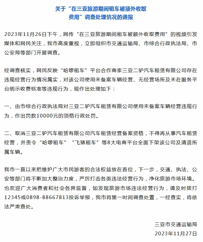 經調查核實,網民反映“哈啰租車”平臺合作商家三亞二驢汽車租賃有限公司存在違規(guī)經營行為情況屬實,對該公司使用未備案車輛經營、無經營場所及未在服務平臺明示收費標準等違規(guī)行為,現作出處理如下: