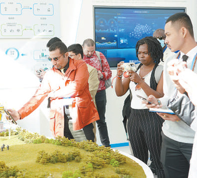 2023“一帶一路”媒體合作論壇聯(lián)合采訪團(tuán)成員參觀中國能建數(shù)字化展廳。