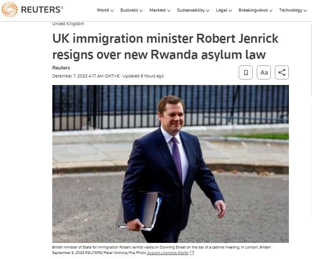 報道稱,詹里克對英國政府當(dāng)日公布的“盧旺達(dá)安全(庇護(hù)和移民)法案草案”持有不同意見。他在一封辭職信中表示,該立法是在2024年英國大選之前解決移民危機(jī)的“最后機(jī)會之一”。