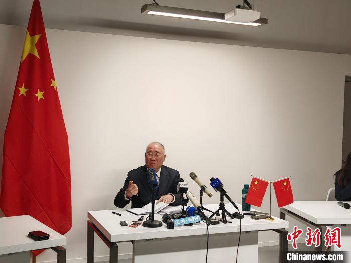 12月9日,阿聯(lián)酋迪拜,中國氣候變化事務(wù)特使解振華在新聞發(fā)布會上回應(yīng)中外媒體的提問。 中新社記者 龐無忌 攝