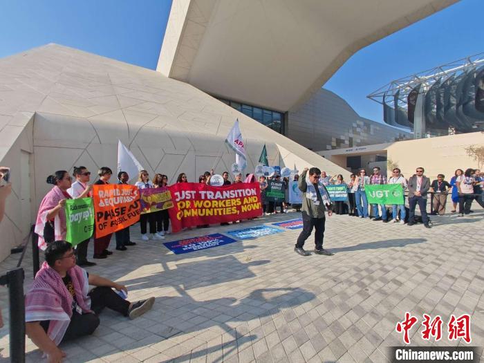 12月9日,阿聯(lián)酋迪拜,抗議者在聯(lián)合國氣候變化迪拜大會藍(lán)區(qū)會場集會并呼吁公正轉(zhuǎn)型?!≈行律缬浾?龐無忌 攝