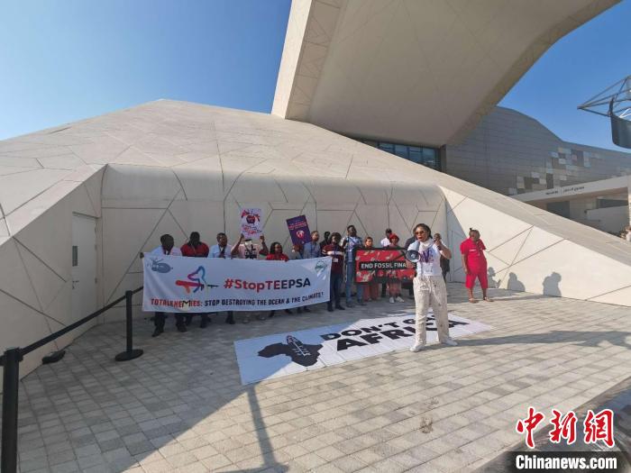 12月10日,阿聯(lián)酋迪拜,來自非洲的抗議者在COP28期間呼吁保護海洋環(huán)境、應對氣候變化,反對在非洲使用化石燃料?!≈行律缬浾?龐無忌 攝