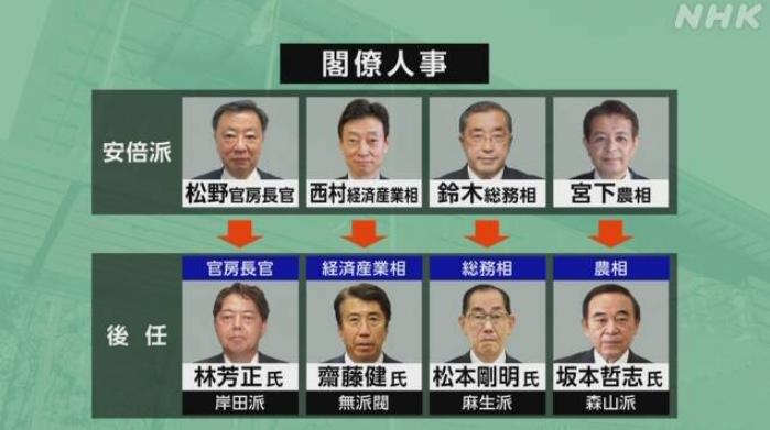 據(jù)報道,岸田將會把官房長官、經(jīng)產(chǎn)相、總務相和農(nóng)相四個重要職位換人,此前任外相的林芳正將接替松野博一擔任官房長官,經(jīng)產(chǎn)相、總務相和農(nóng)相將分別由齋藤健、松本剛明和坂本哲志擔任。四人均不屬于安倍派成員。