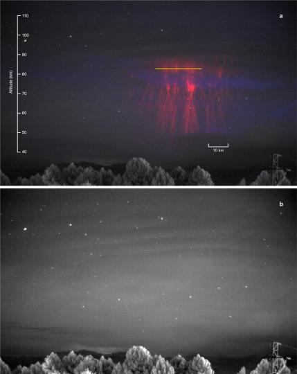 論文作者表示,在這次精靈現(xiàn)象前后觀測(cè)到亮度增強(qiáng),說(shuō)明水母形精靈上部有一次靈異(ghost)事件。他們隨后確定了高速進(jìn)入地球大氣的行星際塵埃顆粒的迅速消融導(dǎo)致的金屬痕跡,并在此基礎(chǔ)上研究發(fā)現(xiàn),綠光的主要來(lái)源為鐵、鎳、原子氧和氮。此外,本次還探測(cè)到其他靈異顏色,包括黃色和桔黃色。(完)
