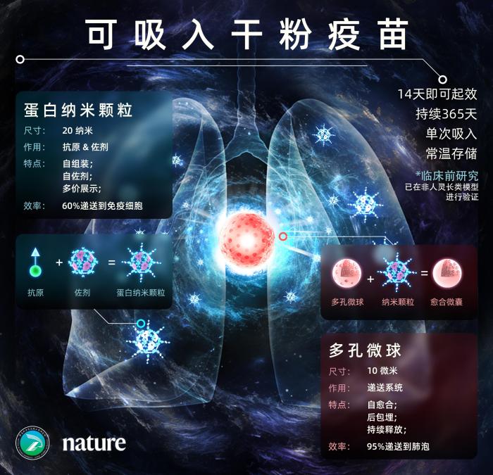 目前,這項(xiàng)研究已在實(shí)驗(yàn)室成功制備出新型干粉吸入式疫苗,并且在動物模型上顯示出能夠高效阻斷呼吸道病毒的感染與傳播。北京時間12月14日凌晨,相關(guān)成果論文在國際著名學(xué)術(shù)期刊《自然》(Nature)上線發(fā)表。