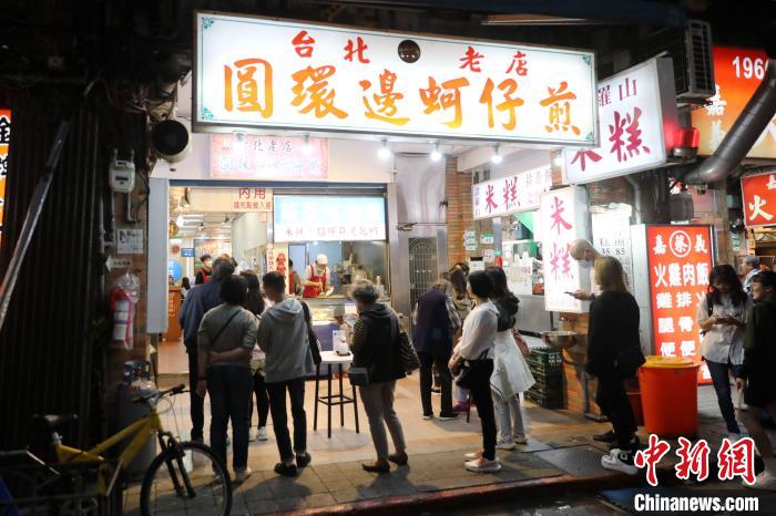 近日,臺北寧夏夜市里的圓環(huán)邊蚵仔煎店,顧客在門口排隊。 中新社記者 陳小愿 攝