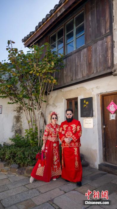 就在不久前,美莎和沙吶沙拍了中式婚紗照,身著紅色秀禾服的美莎選擇與先生在白墻灰瓦的中式園林建筑中留下二人愛情的見證。而兩人的婚禮也頗有戲劇性,雙方父母在土庫曼斯坦家鄉(xiāng)為兩人辦酒,沒能回國的他們則通過視頻遠程參加了自己的婚禮,接受家人們的祝福。美莎笑稱,她的微信婚禮很特別,很能代表中國速度。