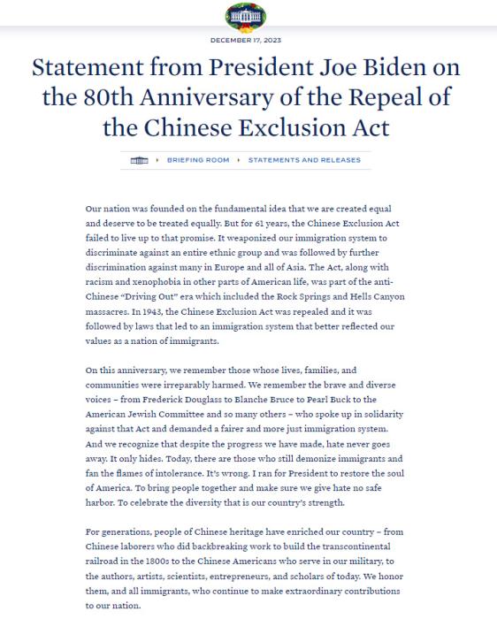 據(jù)白宮網站消息,拜登在文告中指出,“人人生而平等,應該受到平等對待。但61年來,排華法案未能兌現(xiàn)這一承諾。它將我們的移民制度武器化,歧視整個種族群體,隨后又進一步歧視歐洲和整個亞洲的許多人?!?/p>