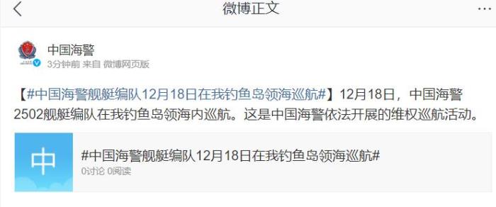 中新網(wǎng)12月18日電 據(jù)中國(guó)海警官方微博消息,12月18日,中國(guó)海警2502艦艇編隊(duì)在我釣魚(yú)島領(lǐng)海內(nèi)巡航。這是中國(guó)海警依法開(kāi)展的維權(quán)巡航活動(dòng)。