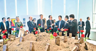 外國(guó)駐華使節(jié)和外交官在深圳南山能源生態(tài)園內(nèi)的科普教育基地參觀藝術(shù)作品《巖石里的花》。