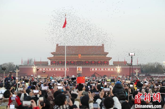 隨著國旗升至旗桿頂端,萬羽和平鴿騰空而起,繞著天安門廣場盤旋。在《歌唱祖國》的旋律中,“新年快樂!”“我愛你,祖國!”……歡呼聲和掌聲此起彼伏。