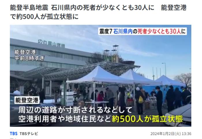 據(jù)報(bào)道,包括機(jī)場使用者和當(dāng)?shù)鼐用裨趦?nèi)累計(jì)約500人,目前被困于輪島市能登機(jī)場,周圍道路被切斷。