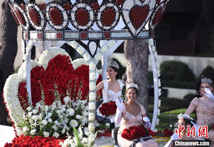 當(dāng)?shù)貢r(shí)間1月1日上午,第135屆美國玫瑰花車游行在加利福尼亞州歷史文化名城帕薩迪納市舉行。圖為2024年度“玫瑰皇后和玫瑰公主”花車?!≈行律缬浾?張朔 攝