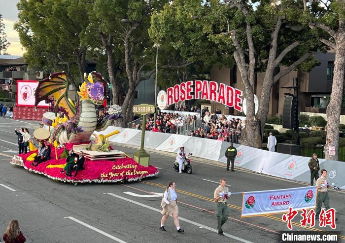 當(dāng)?shù)貢r(shí)間1月1日上午,第135屆美國玫瑰花車游行在加利福尼亞州歷史文化名城帕薩迪納市舉行。圖為南加州阿罕布拉市帶來的“慶祝龍年”主題花車。 中新社記者 張朔 攝
