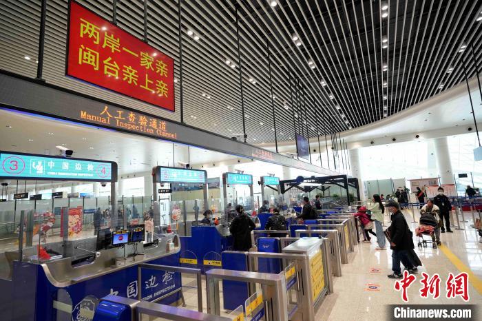 1月1日上午,廈門邊檢總站高崎邊檢站在廈門五通客運碼頭為新年第一批“小三通”入境臺胞辦理邊檢手續(xù)。國家移民管理局供圖