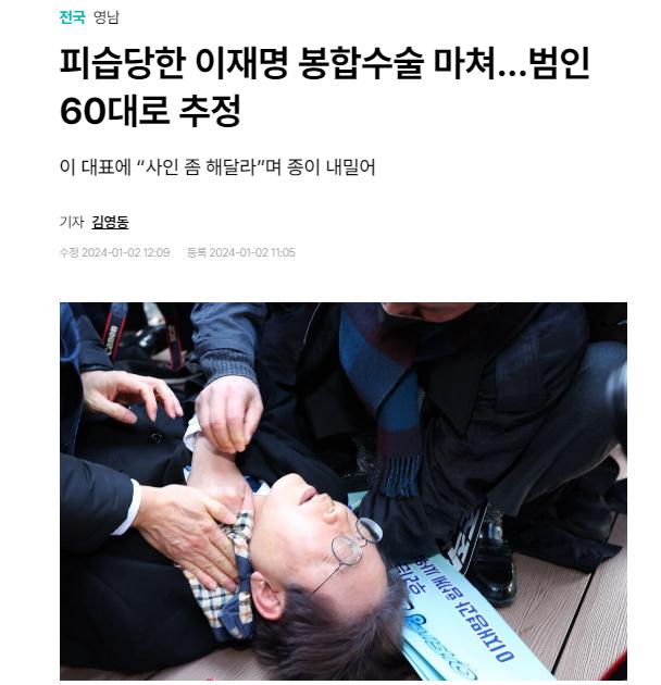 中新網(wǎng)1月2日電 綜合韓媒報(bào)道,當(dāng)?shù)貢r(shí)間2日,韓國最大在野黨共同民主黨黨首李在明在釜山遇襲后,接受了縫合手術(shù)。