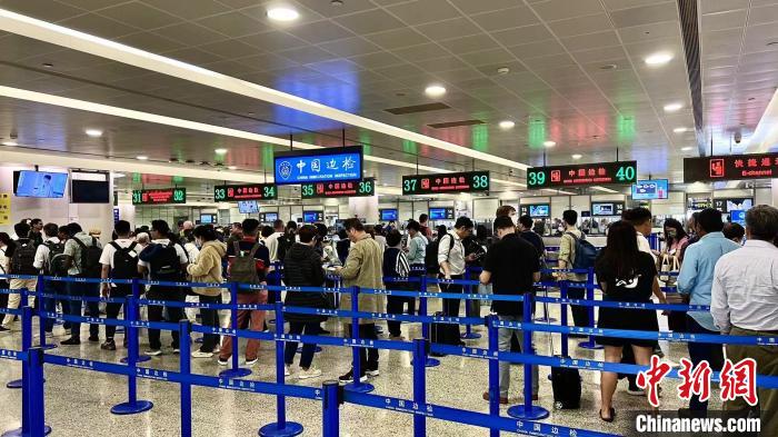 上海浦東國際機(jī)場邊檢查驗(yàn)大廳,旅客有序排隊候檢。黃波 攝