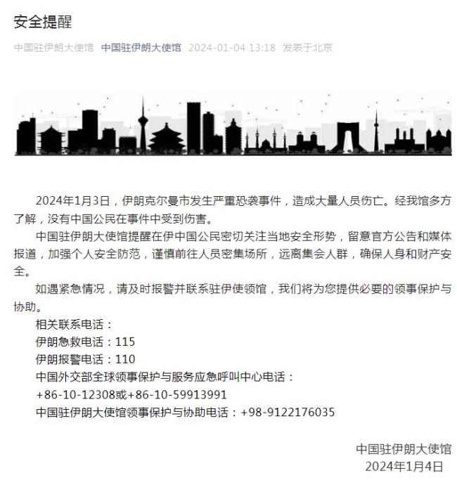 中新網(wǎng)1月4日電 據(jù)中國駐伊朗大使館微信公眾號消息,2024年1月3日,伊朗克爾曼市發(fā)生嚴(yán)重恐襲事件,造成大量人員傷亡。經(jīng)大使館多方了解,沒有中國公民在事件中受到傷害。