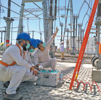在巴基斯坦默蒂亞里—拉合爾直流輸電項(xiàng)目現(xiàn)場(chǎng),中巴工程師對(duì)設(shè)備開(kāi)展日常檢修。