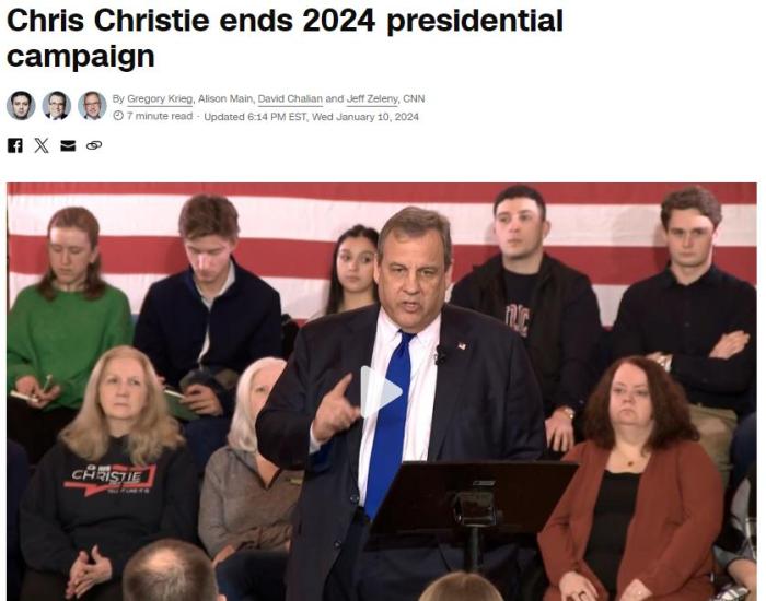 中新網(wǎng)1月11日電 綜合外媒報道,美國前新澤西州州長克里斯蒂(Chris Christie)當(dāng)?shù)貢r間10日宣布結(jié)束2024年美國總統(tǒng)競選。盡管克里斯蒂作為初選“戰(zhàn)場”上前總統(tǒng)特朗普的主要批評者而備受關(guān)注,但他并未能在民調(diào)中獲得廣泛支持。