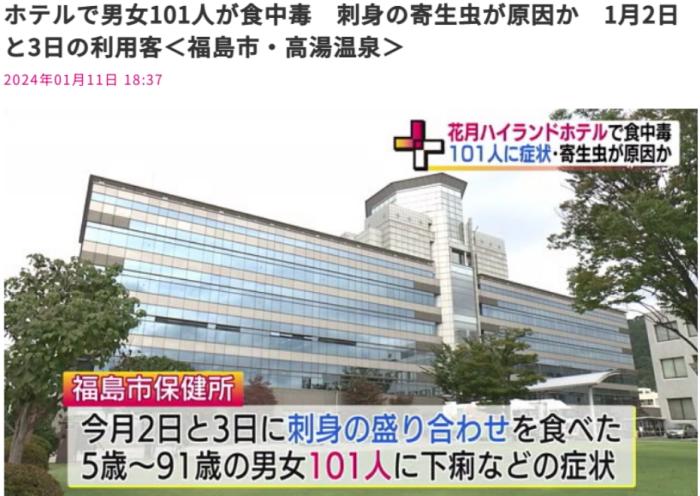 報道稱,中毒者年齡下至5歲,上至91歲。保健所在調(diào)查中發(fā)現(xiàn)該酒店提供的魚類刺身上檢測出寄生蟲,并認為這就是導(dǎo)致此次食物中毒的原因。