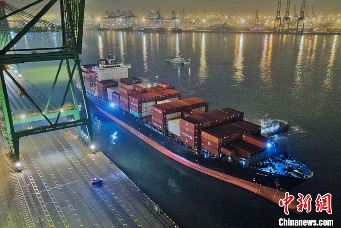 1月16日晚,裝載著2500余噸智利車?yán)遄拥拇笮图b箱班輪“巴赫”號(hào),順利抵達(dá)天津港太平洋國際集裝箱碼頭,標(biāo)志著天津港與南美洲直航的首條“車?yán)遄涌炀€”正式開通?!败?yán)遄涌炀€”始發(fā)于智利圣安東尼奧港,直抵天津港。未來一周,還將有2艘次智利車?yán)遄迂洿诌_(dá)天津港,累計(jì)8300噸車?yán)遄蛹捌渌厦乐蕻a(chǎn)品從天津港上岸。(無人機(jī)照片) 中新社記者 佟郁 攝