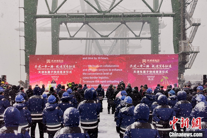 1月17日,天津車?yán)遄涌炀€首發(fā)儀式在天津港太平洋國際集裝箱碼頭舉行。“車?yán)遄涌炀€”始發(fā)于智利圣安東尼奧港,直抵天津港。未來一周,還將有2艘次智利車?yán)遄迂洿诌_(dá)天津港,累計(jì)8300噸車?yán)遄蛹捌渌厦乐蕻a(chǎn)品從天津港上岸。 中新社記者 佟郁 攝