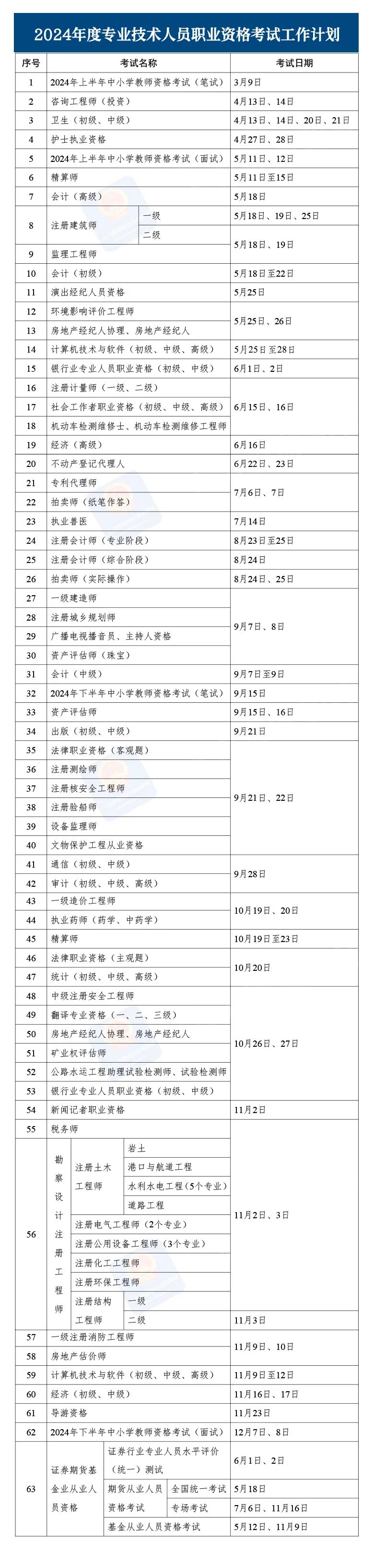 中新網(wǎng)1月17日電 近日,人力資源社會保障部辦公廳印發(fā)《關(guān)于2024年度專業(yè)技術(shù)人員職業(yè)資格考試工作計(jì)劃及有關(guān)事項(xiàng)的通知》,明確了考試時間表。