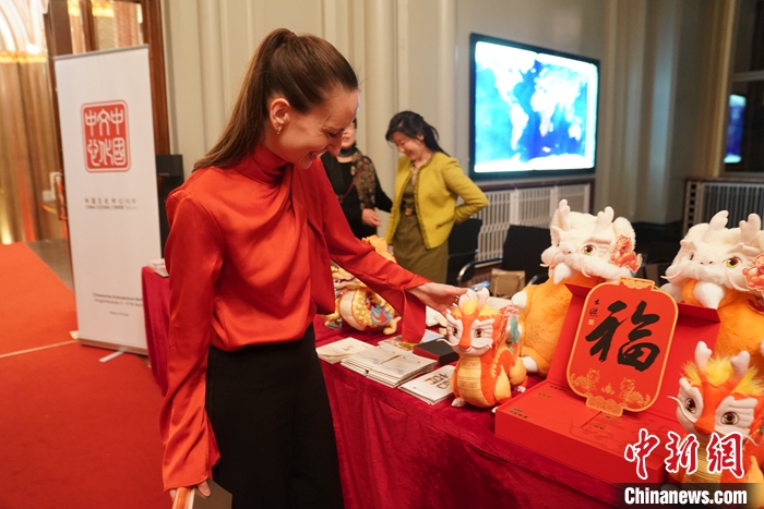 柏林中國文化中心還在現(xiàn)場設(shè)置了文化展臺(tái),向來賓展示來自中國的精美文創(chuàng)藝術(shù)品和文化旅游推廣品,龍年的“吉祥龍”深受來賓喜愛。