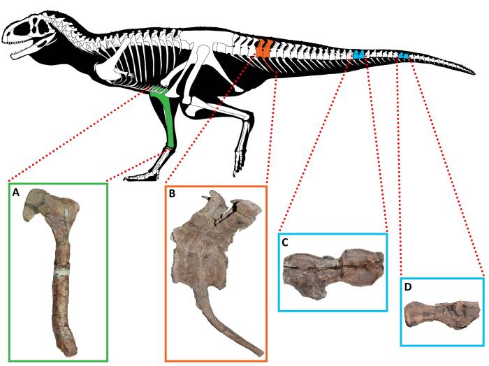 受病變影響的巴塔哥尼亞阿貝力龍骨骼。A.柯氏基爾梅龍右脛骨內(nèi)側(cè)視圖;B.加氏奧卡龍的第5和第6尾椎骨及第5脈弓左側(cè)視圖;C和D為迷霧嚙王龍的中和后尾椎骨左側(cè)視圖(圖片來自Ales)。施普林格·自然/供圖