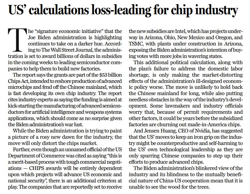 美國失策的經(jīng)濟(jì)政策本已造成市場扭曲,疊加出于政治意圖的算計,以及補(bǔ)貼也無法解決的勞動力短缺問題,這一切只會讓扭曲態(tài)勢進(jìn)一步惡化。此舉不太可能長期遏制中國大陸,但卻給行業(yè)發(fā)展帶來種種不必要的障礙。美國部分國會議員及企業(yè)高管擔(dān)心,受到許可要求及其他因素影響,享受補(bǔ)貼的企業(yè)可能要花費(fèi)很多年才能生產(chǎn)出美國制造的芯片。