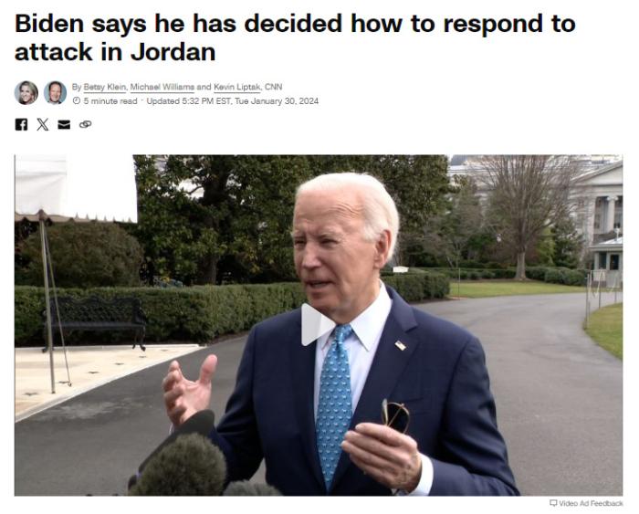 中新網(wǎng)1月31日電 據(jù)美國有線電視新聞網(wǎng)(CNN)報(bào)道,當(dāng)?shù)貢r(shí)間30日,美國總統(tǒng)拜登表示,他已就美國如何應(yīng)對(duì)約旦美軍基地遇襲事件做出決定。早些時(shí)候,該襲擊造成3名美軍士兵死亡、數(shù)十人受傷。