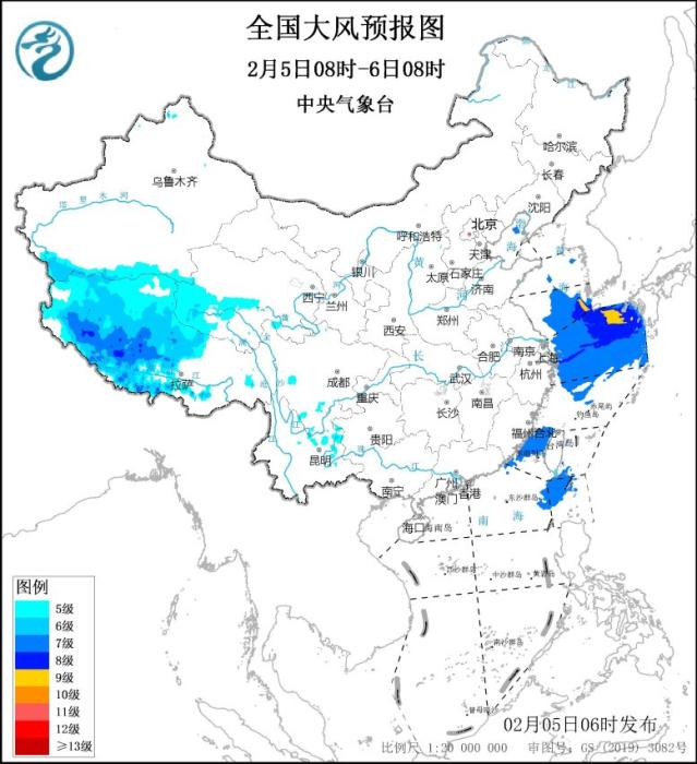 中央氣象臺2月5日06時繼續(xù)發(fā)布大風藍色預警:預計,2月5日08時至6日08時,西藏中西部、青海西南部等地將有5~7級、陣風8級的大風;黃海南部海域、東海大部海域、臺灣海峽、巴士海峽將有7~8級、陣風9級的大風,其中黃海東南部、東海東北部的部分海域風力可達9級、陣風10級。