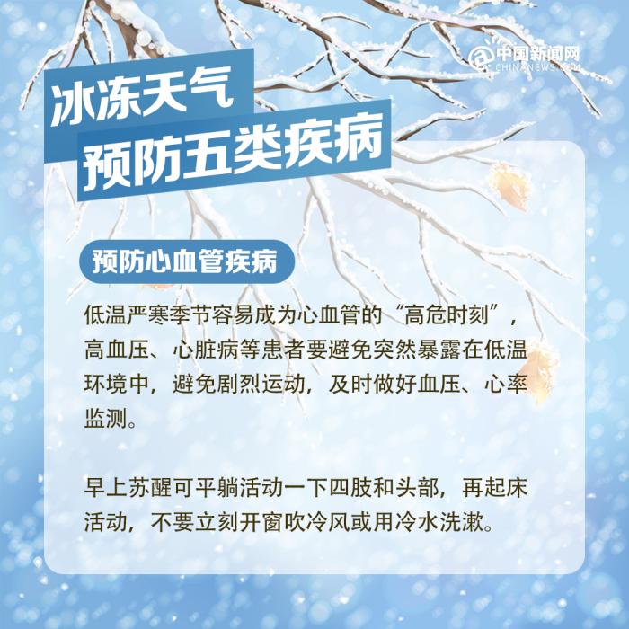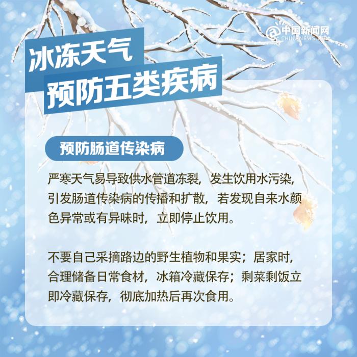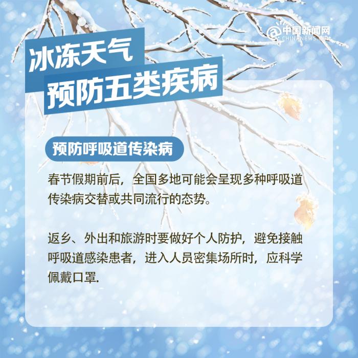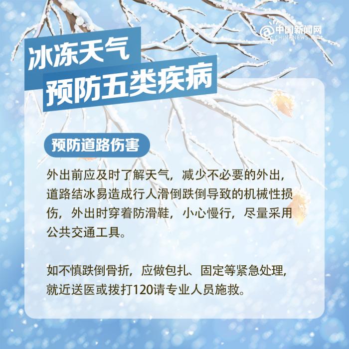 中新網(wǎng)北京2月7日電 近期我國中東部地區(qū)出現(xiàn)大范圍持續(xù)性低溫雨雪冰凍天氣過程,局部地區(qū)累計(jì)降雪量將接近或超過歷史同期,雨雪覆蓋范圍廣、持續(xù)時(shí)間長、凍雨范圍大,雨雪冰凍災(zāi)害風(fēng)險(xiǎn)高,恰逢春節(jié)人員大規(guī)模流動(dòng),以下健康防護(hù)要點(diǎn)請查收。