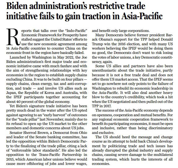 如今美國的一些盟友及伙伴也開始對IPEF失去了熱情,部分原因在于該框架并非自由貿(mào)易協(xié)定,也沒有提供給他們進入美國市場的機會。IPEF似乎已經(jīng)是“窮途末路”,它的處境,映證的是美國在重塑亞太地區(qū)經(jīng)濟領導力方面的失敗,也令美國自2017年退出TPP后再次“信譽掃地”。