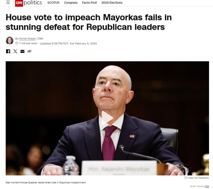 中新網(wǎng)2月7日電 綜合美媒報(bào)道,當(dāng)?shù)貢r(shí)間6日,美國(guó)國(guó)會(huì)眾議院以214票對(duì)216票的表決結(jié)果,未能通過對(duì)美國(guó)國(guó)土安全部長(zhǎng)馬約卡斯的彈劾案。