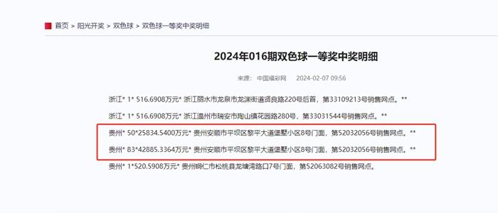 據(jù)中國(guó)福彩網(wǎng)顯示,在貴州省安順市52032056號(hào)銷售網(wǎng)點(diǎn)銷售的兩張一等獎(jiǎng)中獎(jiǎng)彩票中,一張彩票一等獎(jiǎng)中獎(jiǎng)數(shù)量為50注,中獎(jiǎng)金額為25834.5400萬元,另一張中獎(jiǎng)數(shù)量為83注,金額為42885.3364萬元。
