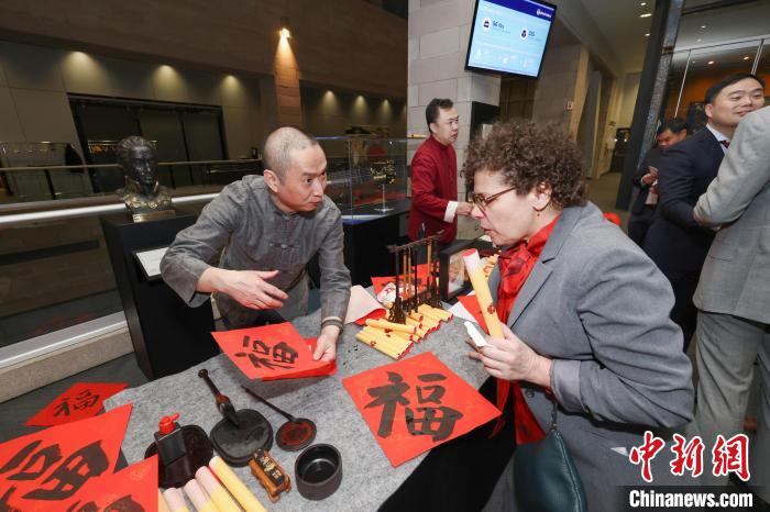 當(dāng)?shù)貢r(shí)間2月6日晚,加拿大蒙特利爾,中國駐蒙特利爾總領(lǐng)館與中國常駐國際民航組織理事會(huì)代表處在國際民航組織(ICAO)總部聯(lián)合舉辦“共慶春節(jié)”主題活動(dòng)。圖為當(dāng)?shù)厝A人書法家(左)向與會(huì)嘉賓講解以中國書法書寫的“?!弊?。 中新社記者 余瑞冬 攝