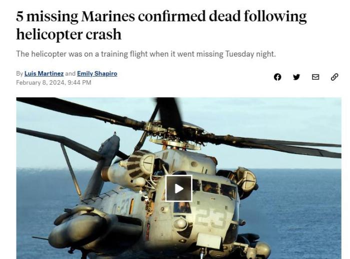 中新網(wǎng)2月8日電 據(jù)美國《紐約時(shí)報(bào)》報(bào)道,美國海軍陸戰(zhàn)隊(duì)當(dāng)?shù)貢r(shí)間8日證實(shí),五名海軍陸戰(zhàn)隊(duì)成員在加州的軍用直升機(jī)墜毀事件中喪生。