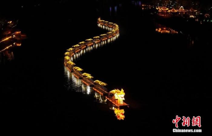 資料圖:一條200米長(zhǎng)的水上金龍?jiān)诎不帐↑S山市休寧縣齊云山鎮(zhèn)橫江江面上游弋而過,龍燈迤邐,與江畔的古民居夜色相映成輝,喜迎新春。施亞磊 攝