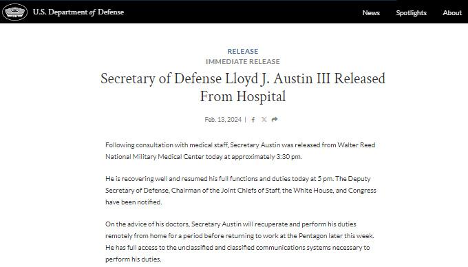 聲明稱,經(jīng)過與醫(yī)務(wù)人員協(xié)商后,奧斯汀于13日下午3時30分左右出院。他恢復(fù)良好,并于當(dāng)日下午5時恢復(fù)了全部職能和職責(zé)。