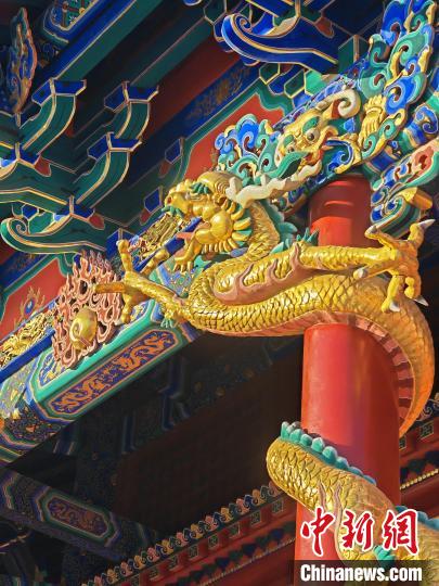崇政殿的抱頭梁被雕成了一條龍的形象,外檐柱頭裝飾高浮雕龍頭,龍尾一直延伸到殿內(nèi)?!?沈陽(yáng)故宮博物院 供圖)