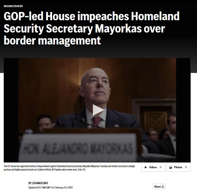 中新網(wǎng)2月14日電 綜合美媒報(bào)道,當(dāng)?shù)貢r(shí)間13日,美國眾議院批準(zhǔn)了針對(duì)邊境安全問題對(duì)國土安全部長(zhǎng)馬約卡斯的彈劾條款,使他成為自1876年以來首位被眾議院彈劾的內(nèi)閣部長(zhǎng)。