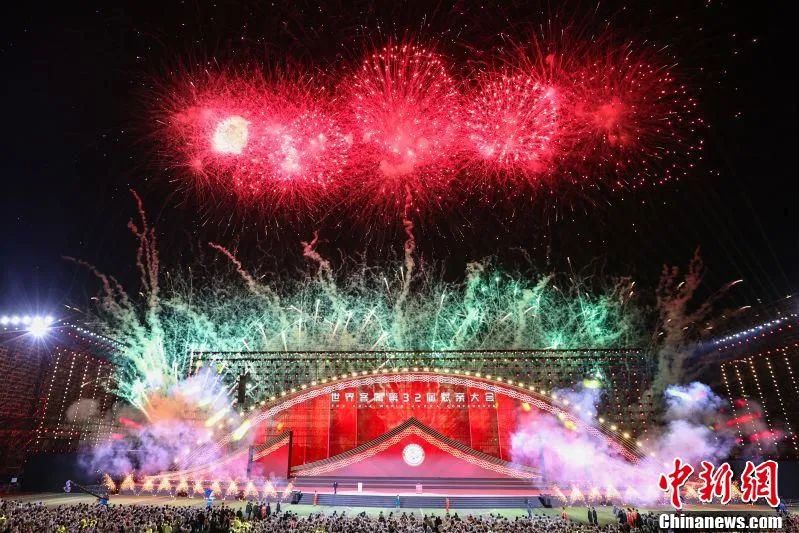 圖為世界客屬第32屆懇親大會開幕式文藝晚會現(xiàn)場的焰火表演。劉力鑫 攝