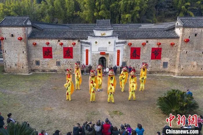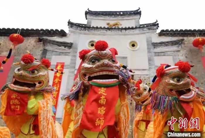 在江西省南部的定南縣“虎形圍”前,一場熱鬧的瑞獅民俗表演正慶祝著中國農(nóng)歷虎年新春。李穗 攝